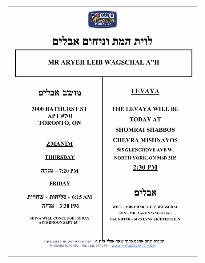 Mr. Aryeh Leib Wagschal A”H Levaya and Shiva