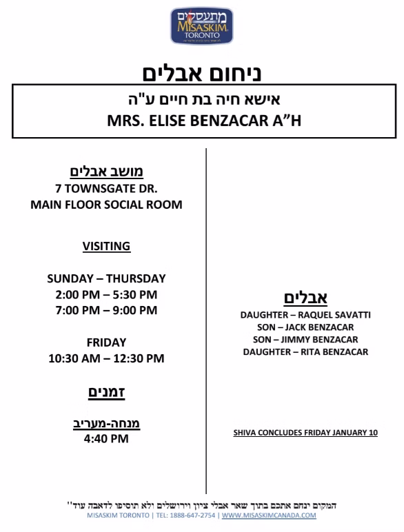Mrs. Elise Benzacar A”H Shiva