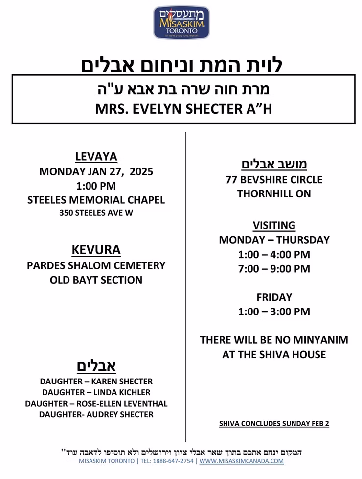 Mrs. Evelyn Shecter A”H Levaya and Shiva