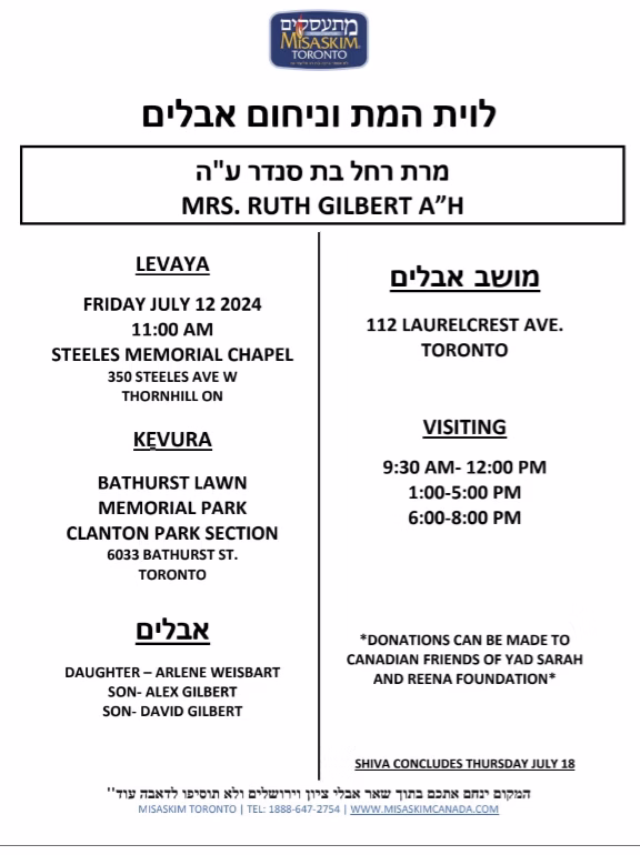 Mrs. Ruth Gilbert A”H Levaya and Shiva