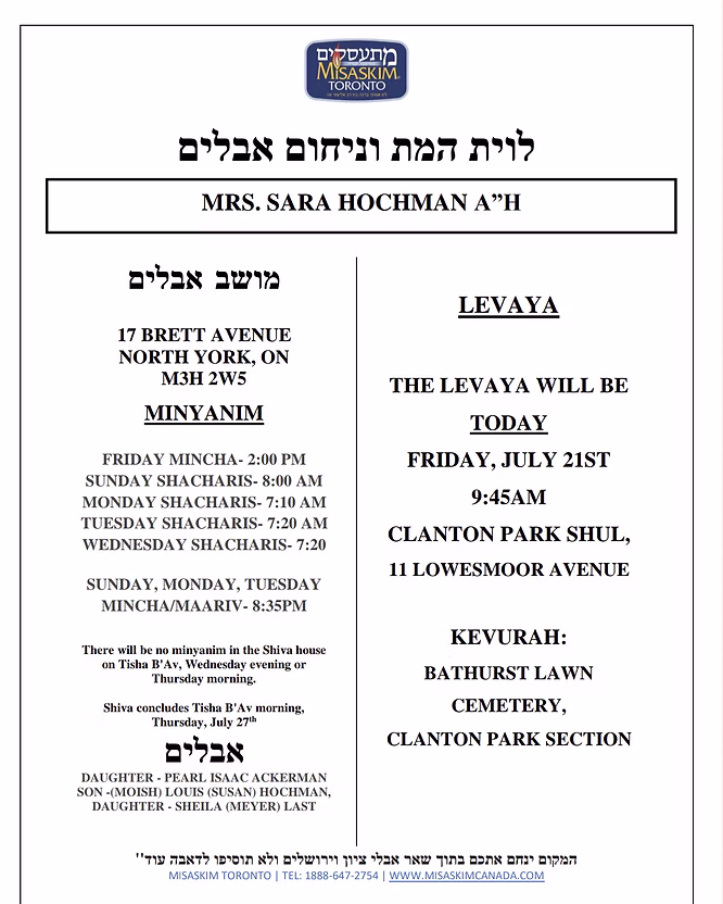 Mrs. Sara Hochman A”H Levaya and Shiva