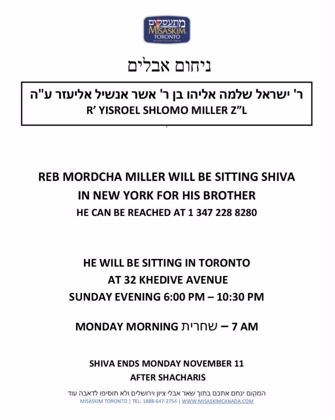 R’ Yisroel Shlomo Miller Z”L Shiva